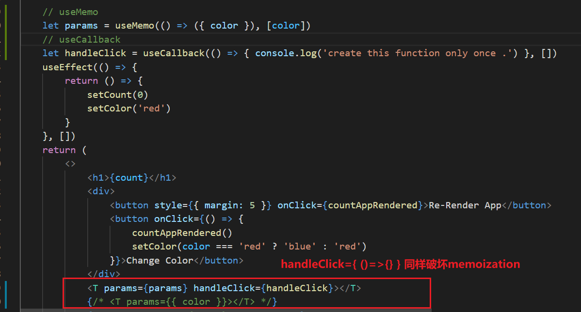 import React, { useEffect, useState, memo } from 'react' import Swatch from './Swatch' const T = memo(Swatch) export default function ComponentWithMemo() { const [count, setCount] = useState(0) const [color, setColor] = useState('red') console.log(`App rendered: ${count}`) const countAppRendered = () => setCount(count + 1) useEffect(() => { return () => { setCount(0) setColor('red') } }, []) return ( <> <h1>{count}</h1> <div> <button style={{ margin: 5 }} onClick={countAppRendered}>Re-Render App</button> <button onClick={() => { countAppRendered() setColor(color === 'red' ? 'blue' : 'red') }}>Change Color</button> </div> <T color={color}></T> {/* <Swatch color={color}></Swatch> */} </> )复制成功